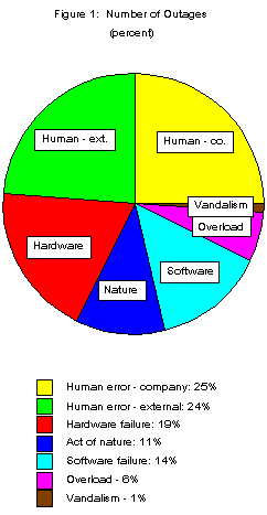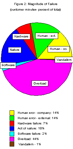 Figure 2 shows that nearly half of the downtime is caused by overloads, which are expected outages. Because of economic and technical constraints, telephone companies do not expect service to be available all the time. For example, Bellcore's availability objective for local exchange networks in its client companies is 99.93 percent[4]. Larger capacity networks could probably eliminate most of this downtime but increase cost. Through decades of experience, the telephone industry has established a balance between benefits and the cost their consumers find acceptable.